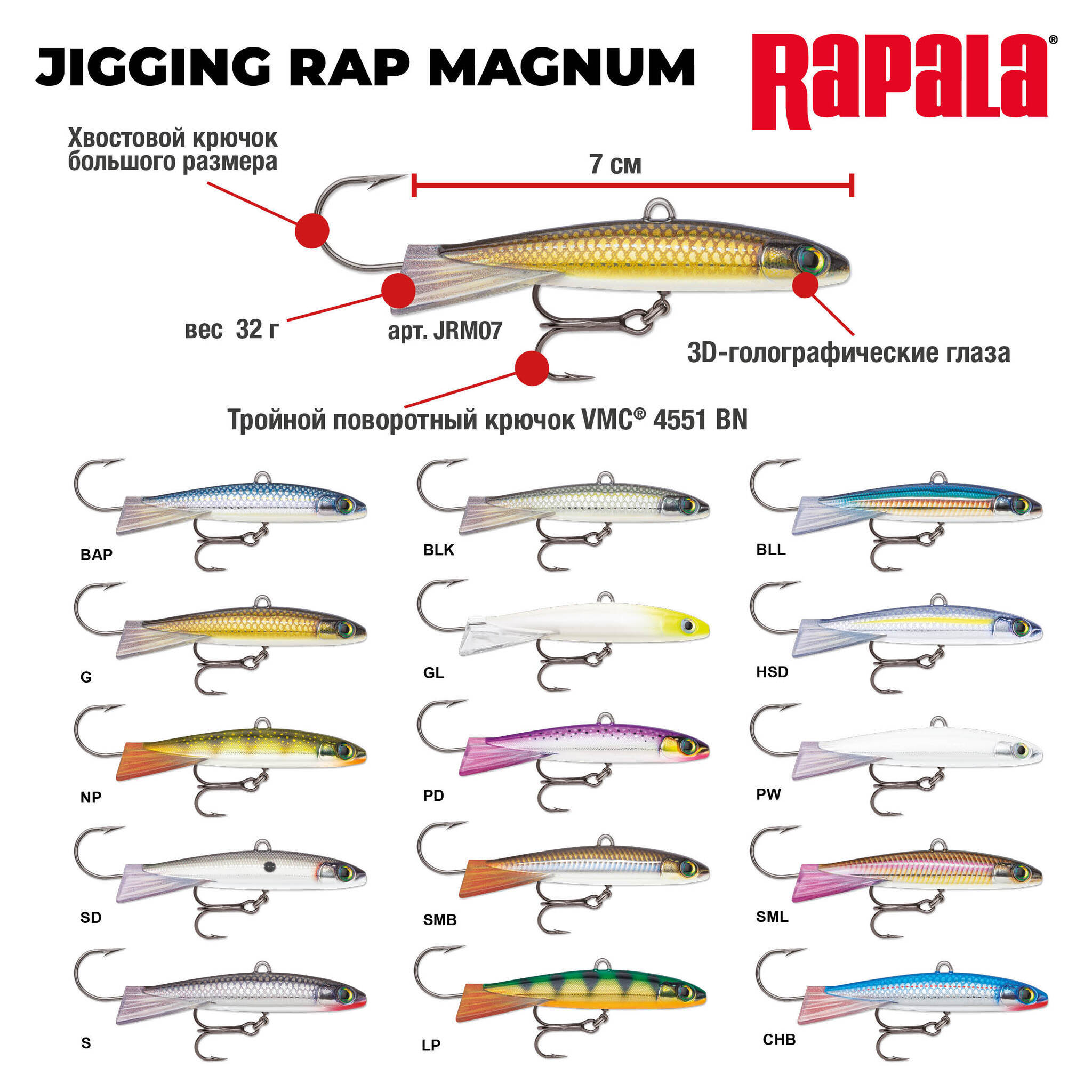 Jigging Rap® Magnum – это тяжёлая приманка, что обеспечивает ей быстрое погружение на значительную глубину, именно туда, где плавает трофейная рыба. Эту модель удобно применять для ловли отдельных рыб, найденных с помощью фронтального эхолота. Jigging Rap® Magnum опускается быстро и точно – и вспыхивает на экране эхолота, так что вы точно будете знать, где находится приманка.