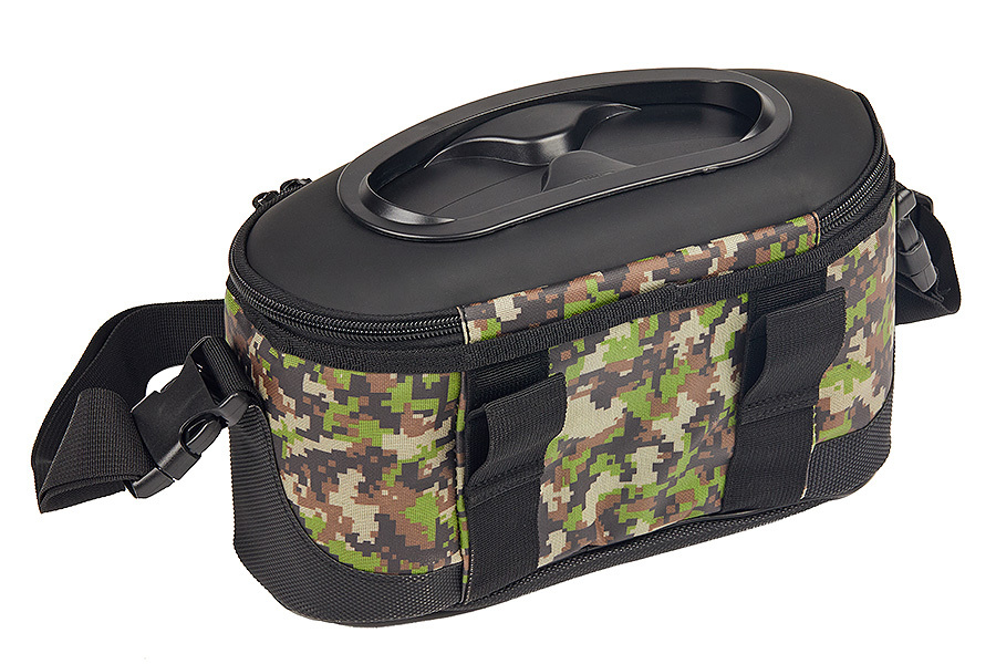 Модель оснащена автоматическими шторками, наплечным ремнем, а также дополнительным фронтальным карманом на молнии.