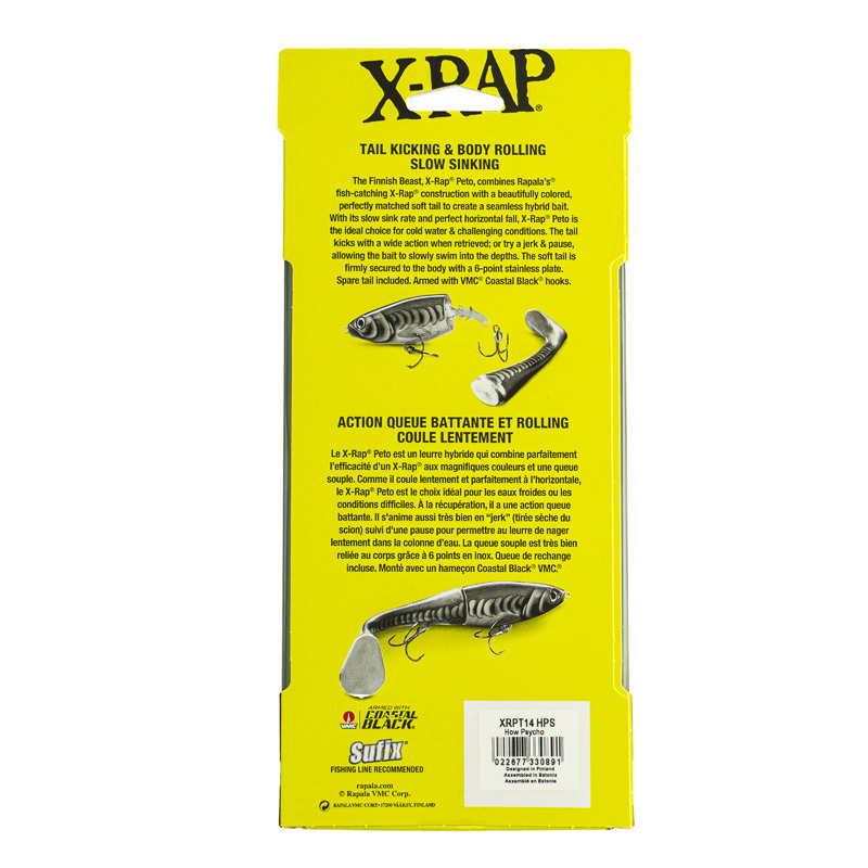 Мягкий ПВХ-хвост закреплен на корпусе 6-точечной пластиной, запасной хвост в комплекте. Благодаря своей низкой скорости погружения и горизонтальному падению, X-Rap Peto является идеальным выбором для холодной воды и сложных условий. Крючки-тройники VMC Coastal Black.